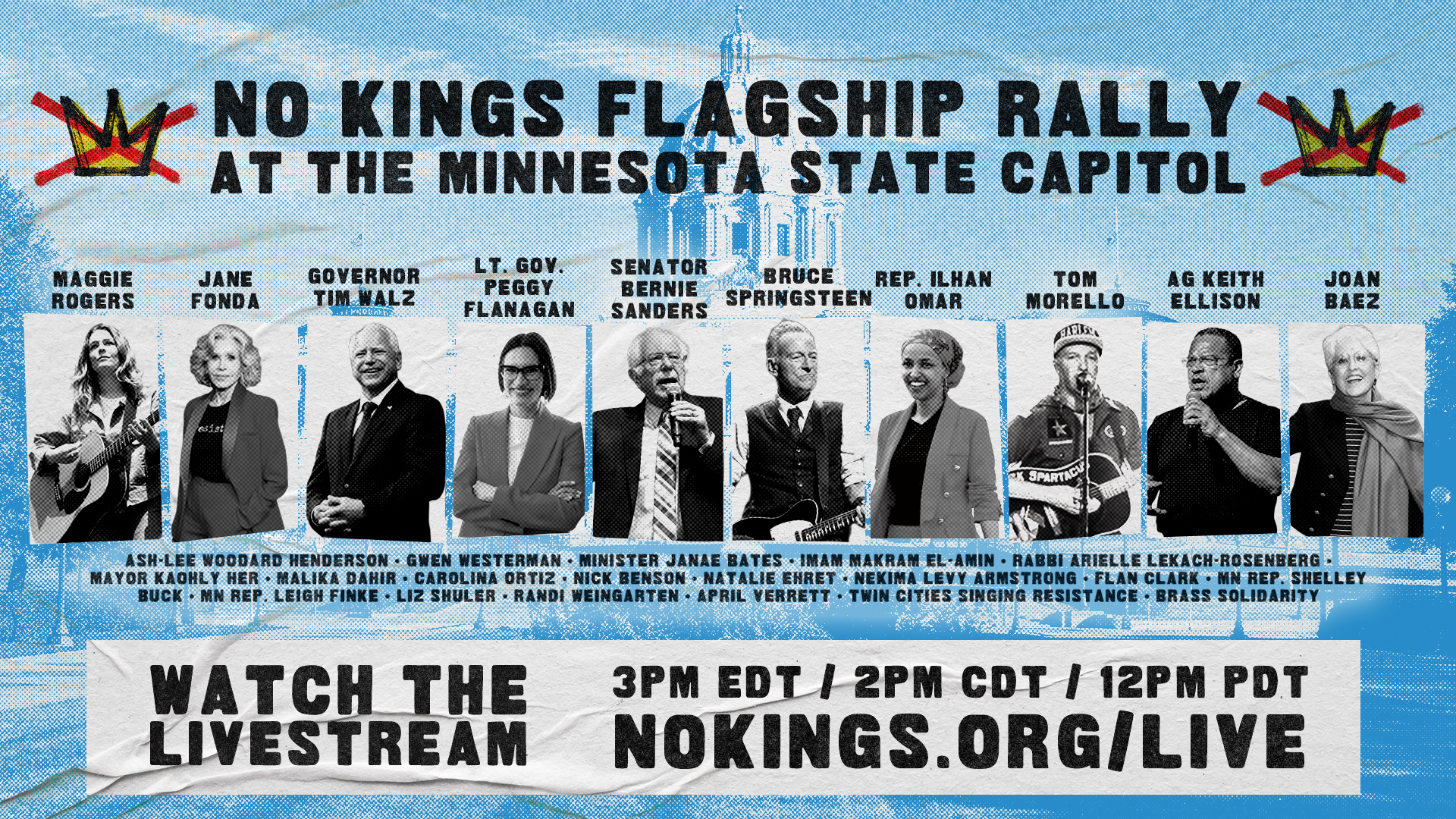 No Kings Flagship Rally at the Minnesota State CapitolLive Stream - March 28, 2026 at 3PM Let’s keep the momentum. Stay tuned for upcoming local No Kings Events. Thanks to everyone who attended a March 28th No Kings Event!!!